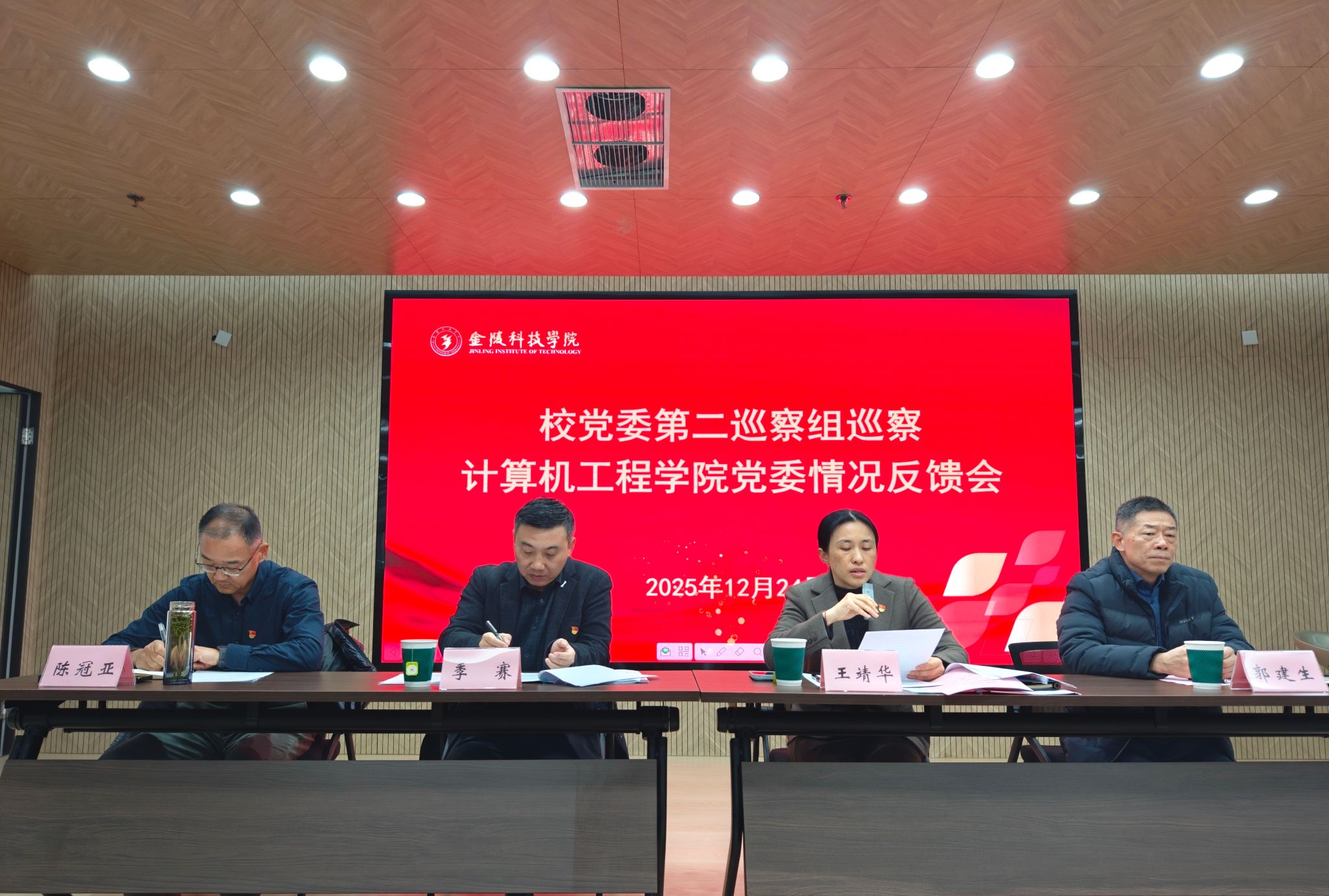 2025年12月24日,校党委第二巡察组在崇文楼110会议室向计算机工程学院党委反馈了巡察情况。校党委常委、纪委书记,校党委第二巡察组组长王靖华向计算机工程学院党委反馈了巡察情况。校长、学院联系校领导季赛以及校党委第二巡察组全体成员、学院全体教职工、学生代表参加会议。计算机工程学院党委书记陈冠亚主持会议并作表态发言。